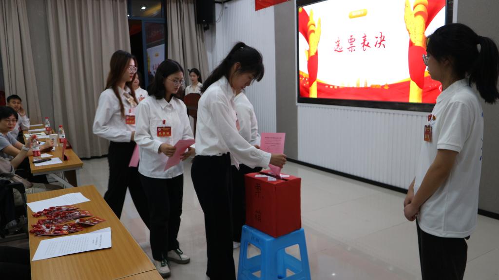 随后,大会进入第三个章程,投票表决。秉持着公平、公正、公开的原则,工作人员首先向大家展示了空票箱和未开封的选票,并在每个投票箱旁分别安排了监票员,最后在工作人员的指引下,学生们依次轮流地进行了投票。
