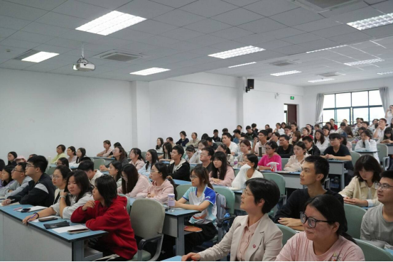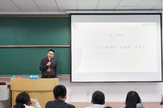 党委副书记蒋红与师生共同参与本次活动。本次讲座特邀化学系94级校友、重庆一中化学教研组组长曹洪凉老师重返母校,作了题为“新高考形势下师范生的专业成长”的主题报告。