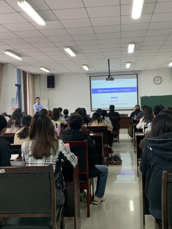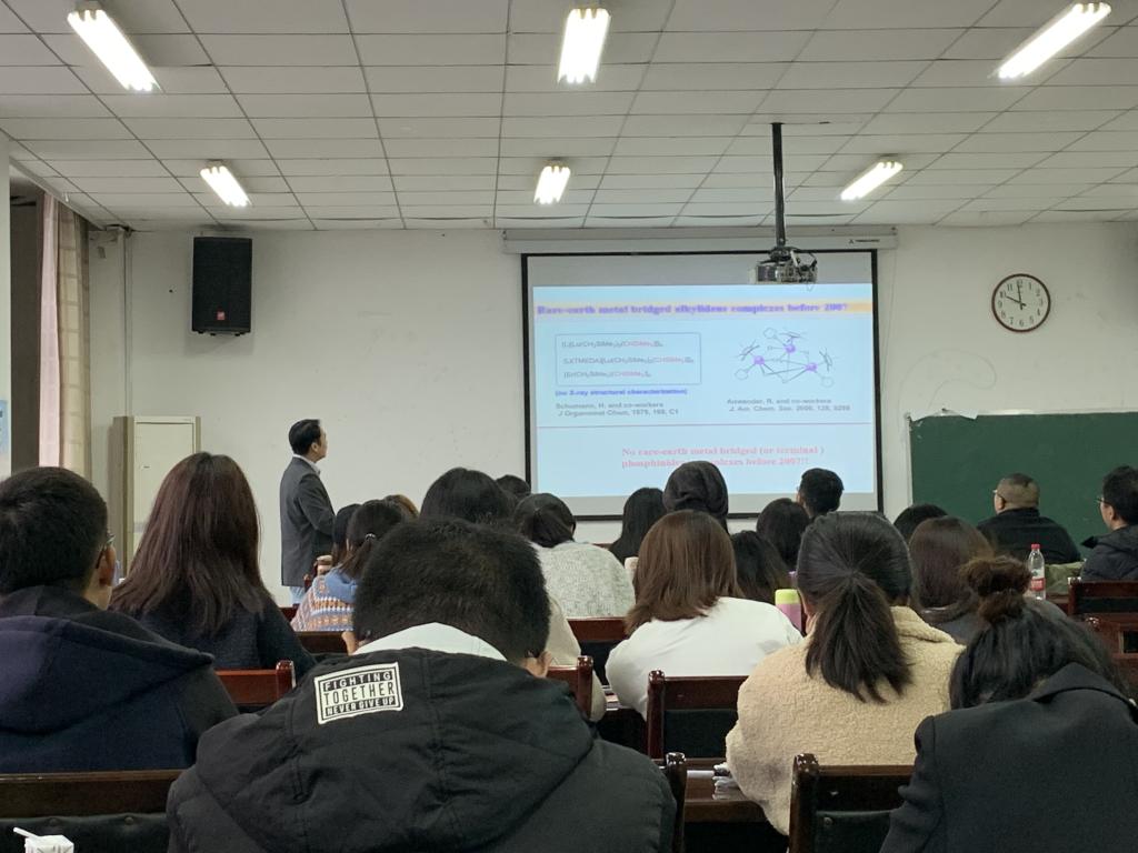 首先由韩英峰教授进行“模板控制的溶液光化学反应”的学术报告,主要向大家介绍了由金属-卡宾模板控制的光化学反应并将其应用于超分子仿酶催化的应用。首先简要的介绍了合成环的反应,然后介绍了一系列在此基础上的进展。陈耀峰研究员作了题为“稀土金属膦宾化合物:从双核到单核和末端的配合物”的学术报告。陈研究员首先简要介绍了过渡金属--主族金属双键化学M=X 具有特色的反应性能和催化功能。随后详细介绍自己课题组在稀土膦宾配合物合成与反应化学等方面取得的进展。两位老师的报告内容丰富、深入浅出,其渊博的学识、引人入胜的讲解、风趣幽默的语言博得全场热烈的掌声。