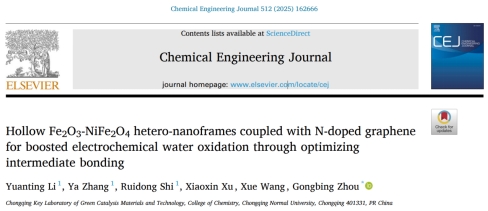 近日,我院表界面能源转化创新团队周功兵教授课题组以《Hollow Fe2O3-NiFe2O4 hetero-nanoframes coupled with N-doped graphene for boosted electrochemical water oxidation through optimizing intermediate bonding》为题在《Chemical Engineering Journal》(中国科学院大类一区TOP期刊,影响因子13.4)上发表最新研究成果,化学学院研究生黎元婷为第一作者,周功兵教授为唯一通讯作者,91九色