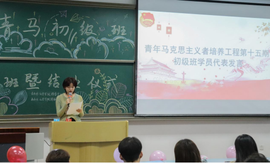 随后由第十四期优秀学员曾卫发言。作为青年工作者,我们要争做榜样,提高自己的理论水平和实践能力,努力成为有理想、有信念、有担当的新时代青年。接着由新生代表王艺杰发言,在今后的学习中,她会提高政治觉悟和理论水平,争做青年先锋模范,为成为一名真正的青年马克思主义骨干而努力奋斗!
