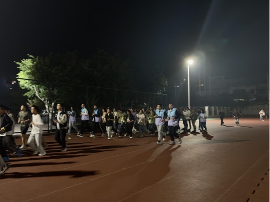 活动开始前,工作人员带领同学们进行热身运动,点燃了活动的热情。随着指令的发出,200多名参与者一起出发,他们手戴荧光饰品,穿越校园,点亮整个夜晚,涌动的人群在跑道上形成了一道道亮丽的风景线。