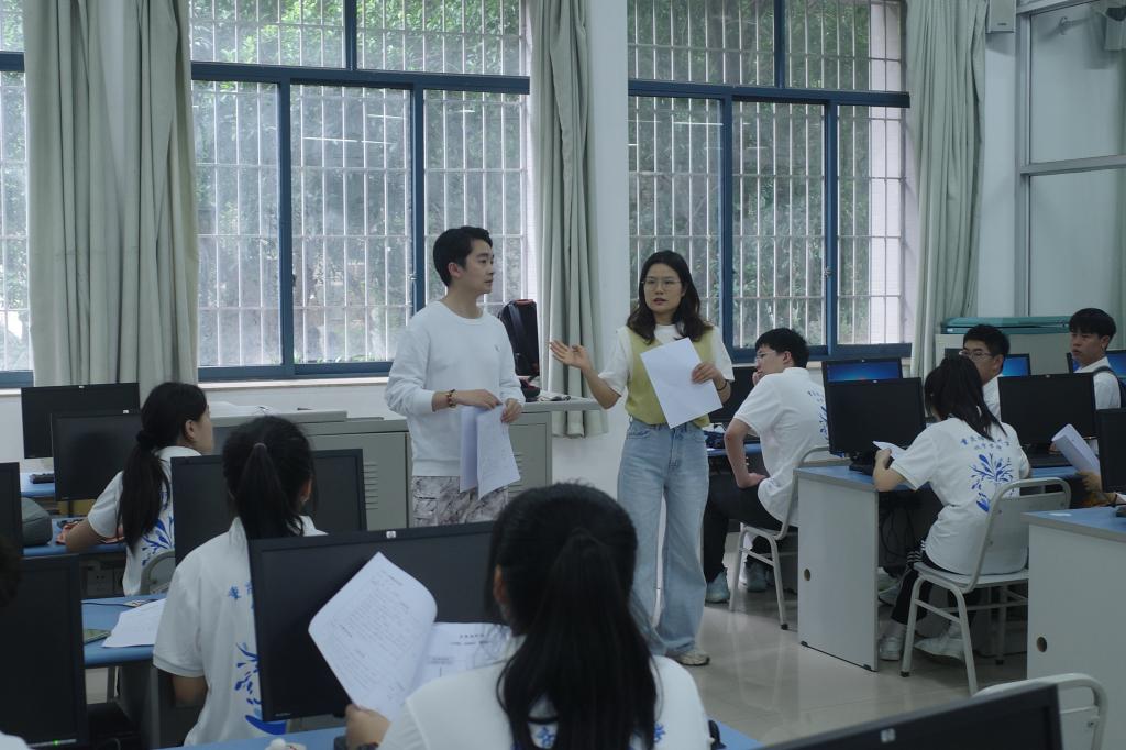 在进行了具体流程的介绍之后,分组培训正式拉开序幕。志愿者们分为三组。第一组的志愿者在微格教室进行教学设备操作培训。老师在微格教室现场指导同学们如何拷贝教案和录像,保证录课过程能够顺利进行。第二组是运送材料、评分、计时小组的培训,在这过程中,陈霞老师对人员的安排进行了一定的调配,不断完善以保证比赛过程的完整性。第三组是对引导小组和打印资料小组的培训,同时第三小组在实地考察了比赛路线,整理出了效果更好的方案,极大提高了引导效率。