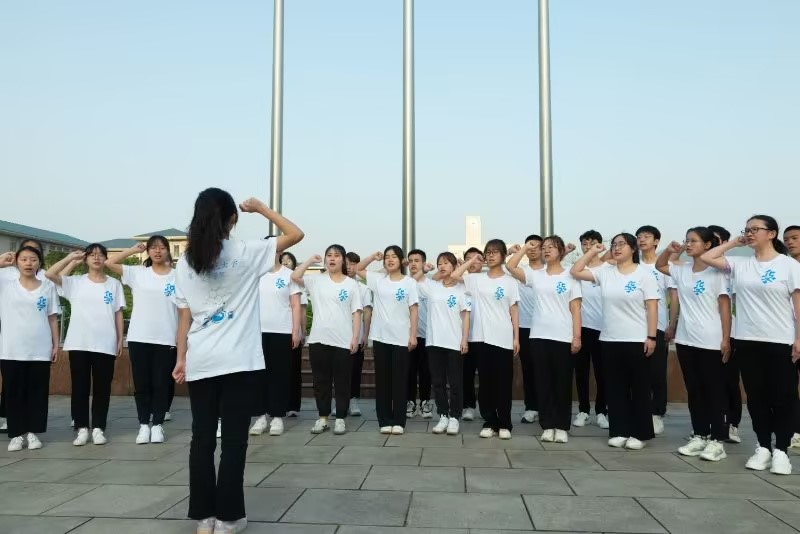 清晨七点四十,升国旗仪式正式开始。英姿飒爽的国旗护卫队迈着整齐划一、铿锵有力的步伐,迎着朝阳,以饱满的热情护送着五星红旗正步走向旗杆。激昂的《义勇军进行曲》奏响,全体师生肃立致礼,深怀对祖国的无限热爱和崇高敬意,五星红旗伴随着振奋人心的歌声冉冉升起,迎风舒展。