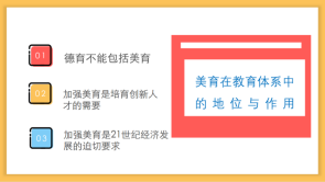 美育是提升审美素养、陶冶情操、温润心灵、激发创新创造活.力的教育。在德智体美劳“五育”中,美育与其他“四育”紧密联系、互相促进。“美术、艺术、科学、技术相辅相成、相互促进、相得益彰”。美育是审美教育、情操教育、心灵教育,也是丰富想象力和培养创新意识的教育,充分挖掘和运用各学科蕴含的体现中华美育精神。