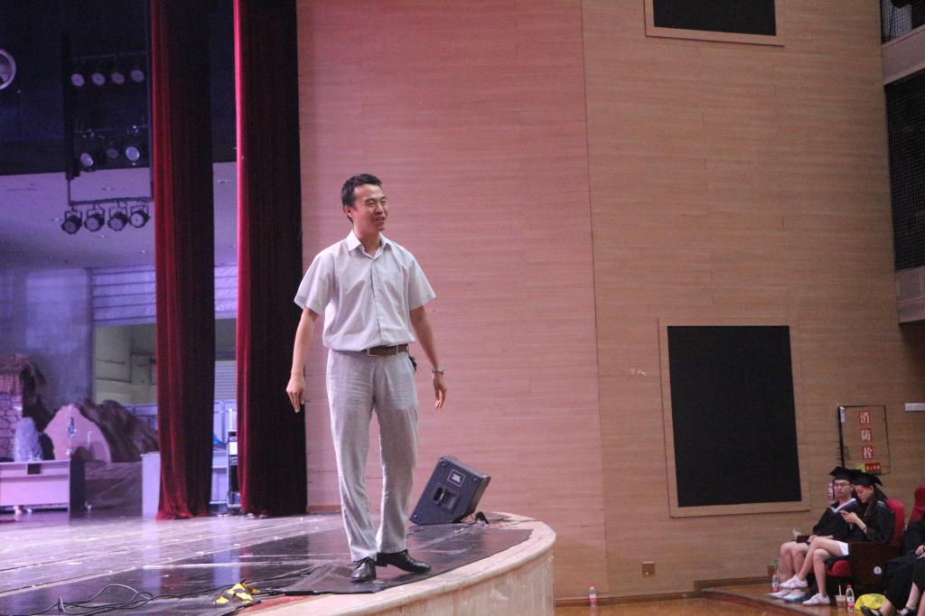 领导于主席台前就坐。庄严肃穆的国歌声响起,在场的老师和同学全体起立,奏唱国歌。接着,研究生代表闵远洪同学上台发言,“落红不是无情物,化作春泥更护花”,老师的指导和帮助,父母的关心和爱护,同学的团结与互助,让化院学子带着梦想,再次出发。本科生代表谭鑫同学说:“毕业不是代表结束,而是欢呼的开始,不是庆祝完成,而是宣告继续向前。”徐玉萍提到,无论鱼翔浅底,还是鹰击长空,我们都要自强不息,不断进步。