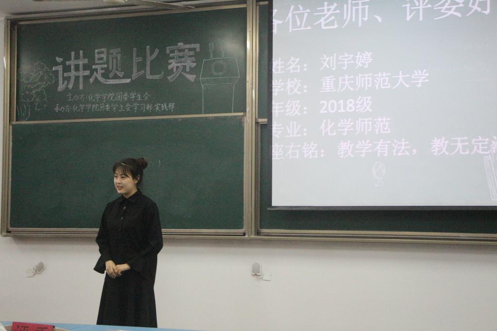 活动伊始,主持人余菲菲宣布比赛开始并宣读比赛规则,选手们按照五人一组的顺序一一进行3分钟的讲题展示。本次参赛选手的题目以及展示顺序由参赛选手事先抽签选择所得。选手们都充分展现了自己的优势,根据自己的化学知识储备量对题目进行解题思路、推导过程的讲解,并且做出了考情分析、知识拓展等。