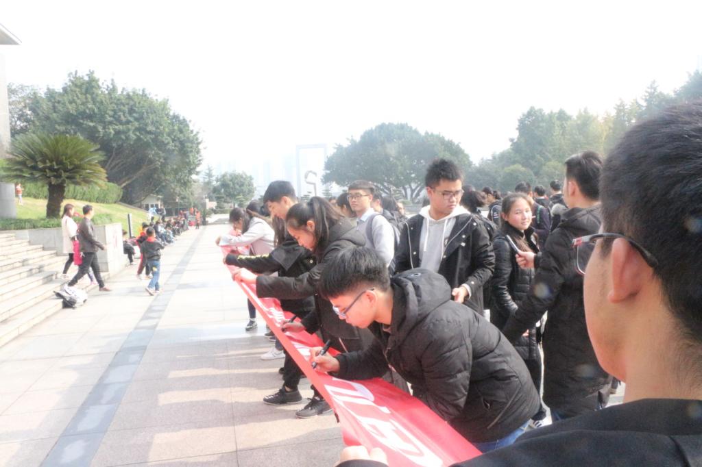 整个祭扫仪式结束后,全体同学在烈士墓广场的雕塑和党旗前留影。接着,大家有序参观了红岩魂陈列馆,进一步深入细致地了解那段悲壮的历史。活动即将结束之际,所有参与活动的同学在“追忆革命先烈,点燃青春梦想”红色横幅上签名留言。