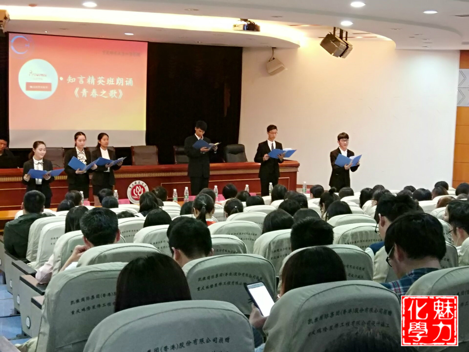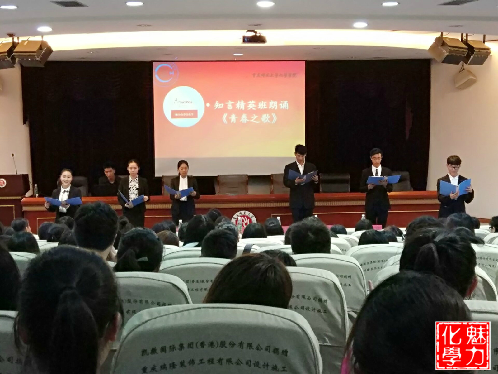 在付院长致辞结束后,学生代表进行发言,来自2015级的唐莉作为此次活动的学生代表表达了对本届化学文化节的期待与祝愿。“知言精英班”的同学朗诵了一首激情澎湃的《青春之歌》,在座同学无不被其气势感染。青春是美好的,在青春伊始,各位同学仍将迎风而立,继续前进。朗诵环节结束后,开幕式活动便步入了尾声。