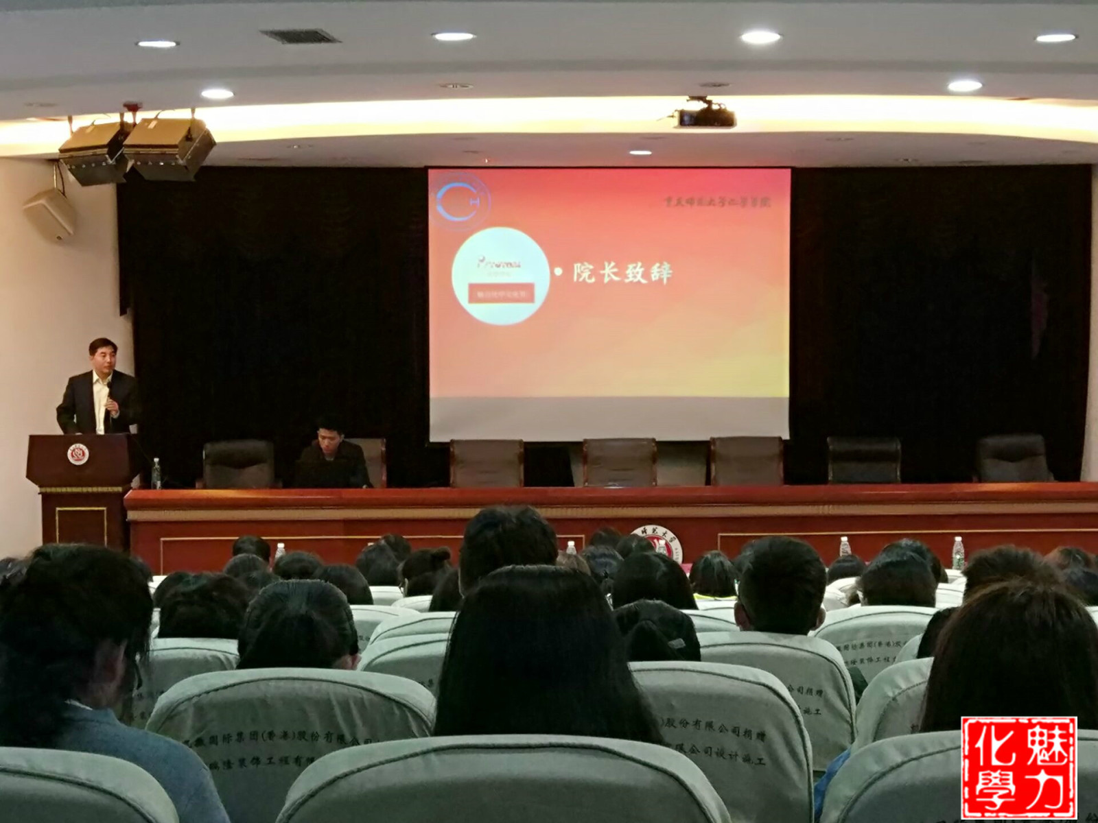 开幕式伊始,院长付文升致辞,介绍了材料化学是从化学的角度研究材料的设计、制备、组成、结构、表征、性质和应用的一门科学。它是材料科学的一个重要分支学科,在新材料的发现和合成,纳米材料制备和修饰工艺的发展以及表征方法的革新等领域所作出了的独到贡献。并以一段化学同学自制的小视频展现了材料化学无穷的魅力。小到日常用品牙刷,大到飞船都有材料化学的影子,材料化学是它们的灵魂。此外,付文升院长还表达了对91九色