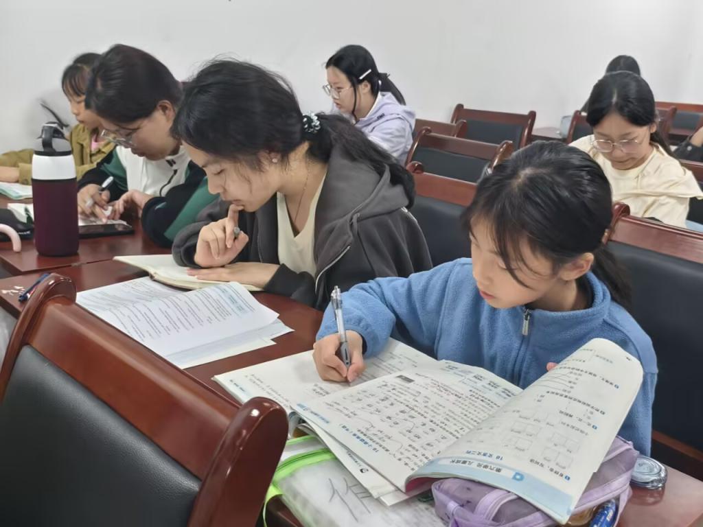 针对不同年龄段孩子的学习需求,志愿者们实行“分层辅导策略”。低年级教室传来阵阵欢笑声,志愿者们正用彩色卡片教孩子们记忆英语单词,“apple是红色的,banana是黄色的……”通过视觉联想和肢体动作,让枯燥的单词记忆变得趣味盎然;高年级区域则呈现出另一番景象,志愿者们围绕中考数学重难点,为初三学生小宇量身定制几何模型解题方案,从辅助线添加技巧到定理应用逻辑,一步步拆解难点,小宇紧锁的眉头逐渐舒展,在草稿纸上写下完整的解题过程后,兴奋地与志愿者击掌庆祝。