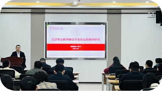 优秀校友冉久飞老师,为全体教职工举行了《漫谈专业教师推动学生就业的独特优势》的主题讲座。讲座由学院党委书记卢洪英主持。