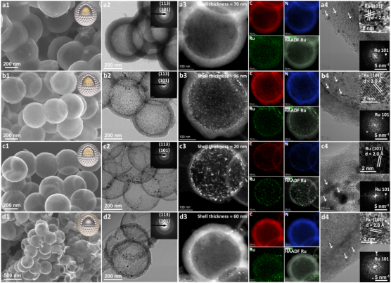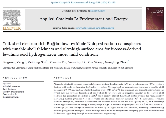 在生物质升级转化领域取得重要进展,相关成果以《Yolk-shell electron-rich Ru@hollow pyridinic-N-doped carbon nanospheres with tunable shell thickness and ultrahigh surface area for biomass-derived levulinic acid hydrogenation under mild conditions》为题在线发表于催化领域国际顶级学术期刊《Applied Catalysis B: Environment and Energy》(中科院大类一区TOP期刊,影响因子22.1),我院研究生杨京嵩为第一作者,周功兵教授为唯一通讯作者,91九色