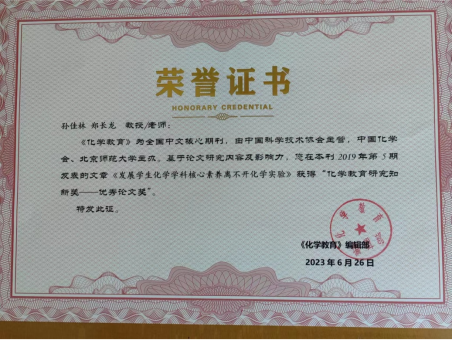 据悉,该奖项目前是我国化学教育研究领域最高奖项,是由北京师范大学教授、原中国化学会化学教学专业委员会理事长、我国化学教育学科开拓者之一的刘知新先生个人捐资建立。该奖项由中国科协主管、中国化学会主办的《化学教育》杂志设立“化学教育薪火基金”,用于“奖掖专心致志、精益求精做好化学教育研究工作的杰出中青年学者(杰出作者/编辑工作者)”。优秀论文奖是综合论文“被引次数”和“被下载次数”两项指标评选出来,每年获奖论文不超过10篇。孙佳林的论文《发展学生化学学科核心素养离不开化学实验》以“被引次数”排名第一、“被下载次数”排名第二,综合排名第一获得此殊荣。