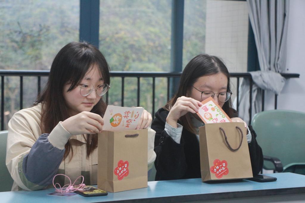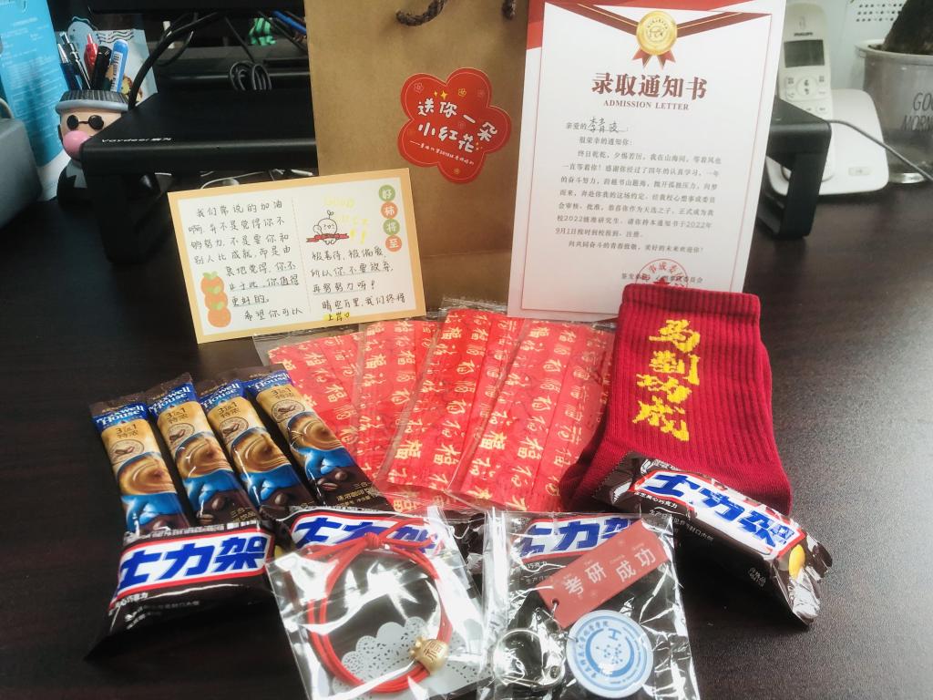 副院长刘玺老师和辅导员刘冰老师以及各年级辅导员都来到现场为同学们加油打气,并为同学们提前准备好了一份份诚意满满的礼物:绣有“金榜题名”、“马到成功”的袜子、福气满满的口罩、带着院徽的钥匙扣、扎头发的红皮筋、补充体力的士力架、提神醒脑的咖啡,这一份份细节满满的礼物满载着化院全体老师对同学们的鼓励与祝福。此外还有来自19级的同学们为即将踏入考场的师兄师姐们亲手书写的明信片,一句句暖心的话语是对师兄师姐们最好的祝福。还有一份由“心想事成委员会”签发的特殊录取通知书:“想上就上重点大学”,祝愿化院考研学子都可以考上自己心仪的学校。
