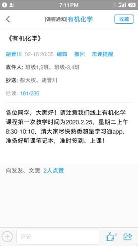 有机化学教研室胡晋川老师从2月10日开始就为线上教学做准备,胡老师通过"剪辑师"软件录制视频,并编辑视频,然后上传至超星学习通平台,在平台录入学生信息后,通过平台向学生发布学习任务,并建立了“有机化学”课程微信群,在线辅导学生作业,解答学生在学习过程中遇到的各种问题。