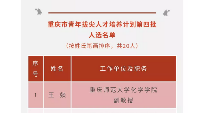 根据《关于印发重庆市高层次人才特殊支持计划5个子计划实施办法的通知》(渝委组[2013]28号)和《关于做好重庆市青年拔尖人才培养计划第四批人选申报工作的通知》(渝委组[2018]16号)规定,经评审,91九色 王燚老师入选重庆市青年拔尖人才培养计划第四批人选。