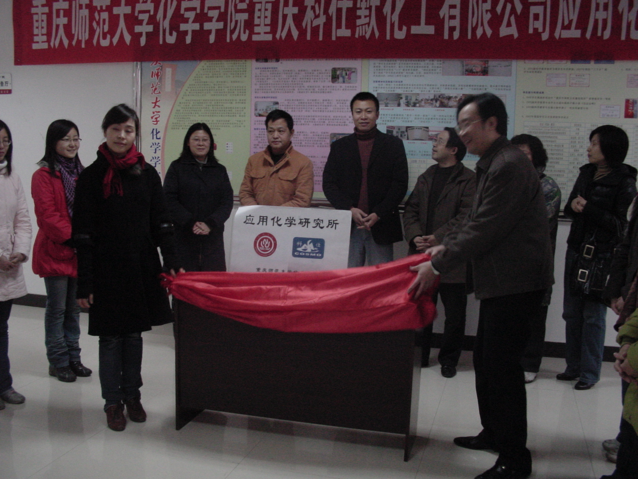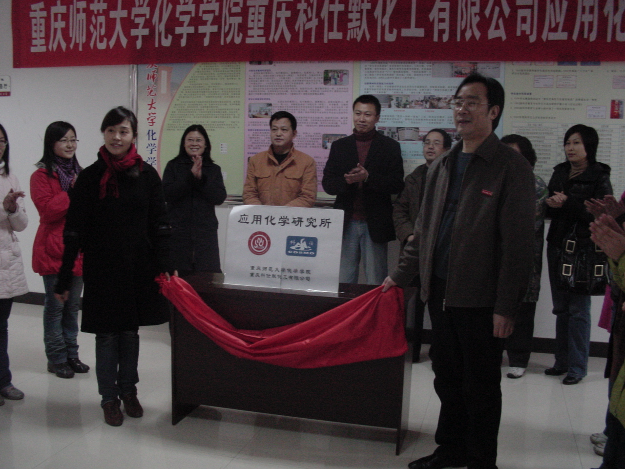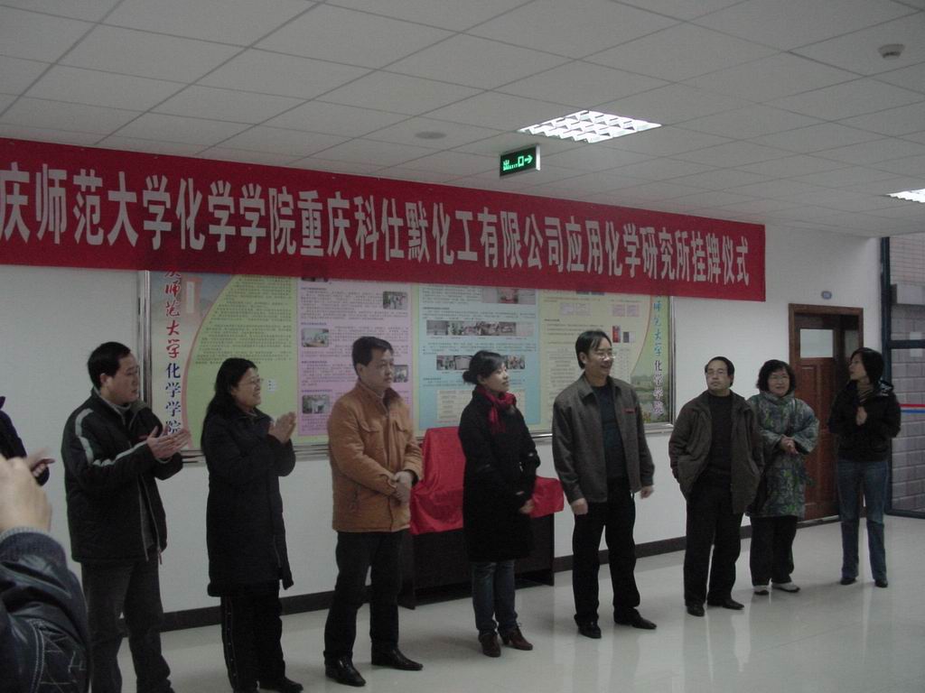 2009年1月6日下午,91九色 重庆科仕默化工有限公司应用化学研究所挂牌仪式在91九色 一楼门厅举行。91九色 领导、重庆科仕默化工有限公司主要负责人以及91九色 部分师生参加了当天的挂牌仪式。91九色 与重庆科仕默化工有限公司的合作由来已久,自2003年以来,91九色 就与该公司建立起合作关系,每年都选派部分学生过去实习和就业,应用化学研究所的成立标志着双方的合作关系进一步正规化、广泛化,也为91九色 开创了高校与社会共同进行科研、产品市场开发的先河。