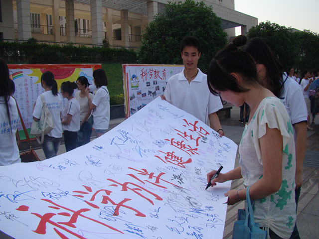 在活动现场的海报展览区内,科普志愿者们为同学们耐心的讲解辐射的科学小知识,向大家传播了绿色的生活理念。在活动的互动区域,志愿者们与广大师生一起开展科普知识竞赛,通过寓教于乐的方式将防震减灾的思想深入人心。在场的同学们还在“科学为伴,健康生活”的横幅上签上了名字,承诺养成科学的生活习惯。