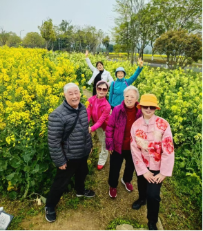 随后,依次观赏了东岛头的湖和大草坪、如金毯般超大油菜花田。期间,偶遇了欢乐竞跑的小学生春游团,路旁排队吃饭的幼儿园春游团,老同志们热情地与他们交流,表达了欣喜与关爱之情。
