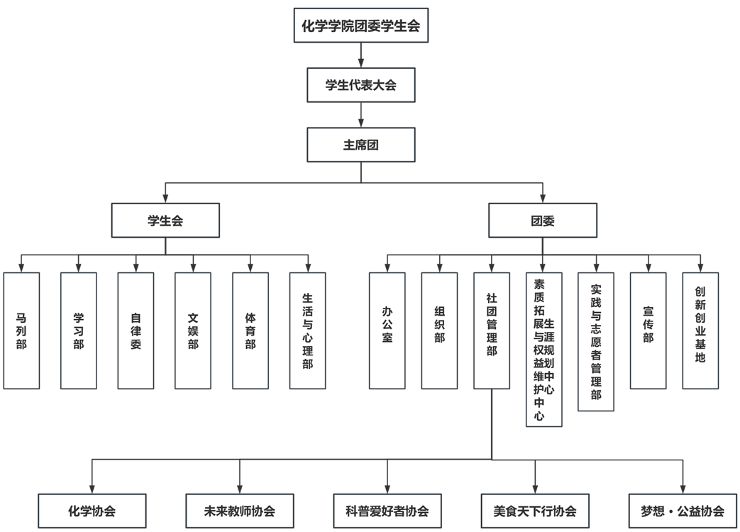 学生代表大会是院团委学生会的最高权力机构,设立主席团行使在学代会闭会期间的权力,由学生代表大会选举产生主席团成员;由院分团委书记审批活动预算,监督其正确行使权力;院学生会设立马列部、学习部、自律委、文娱部、体育部、生活与心理部共6个部门组织院学生会日常工作和活动;院分团委设立办公室、组织部、社团管理部、素质拓展与权益维护中心(生涯规划中心)、实践与志愿者管理部、宣传部、创新创业基地共7个部门,组织院分团委日常工作和